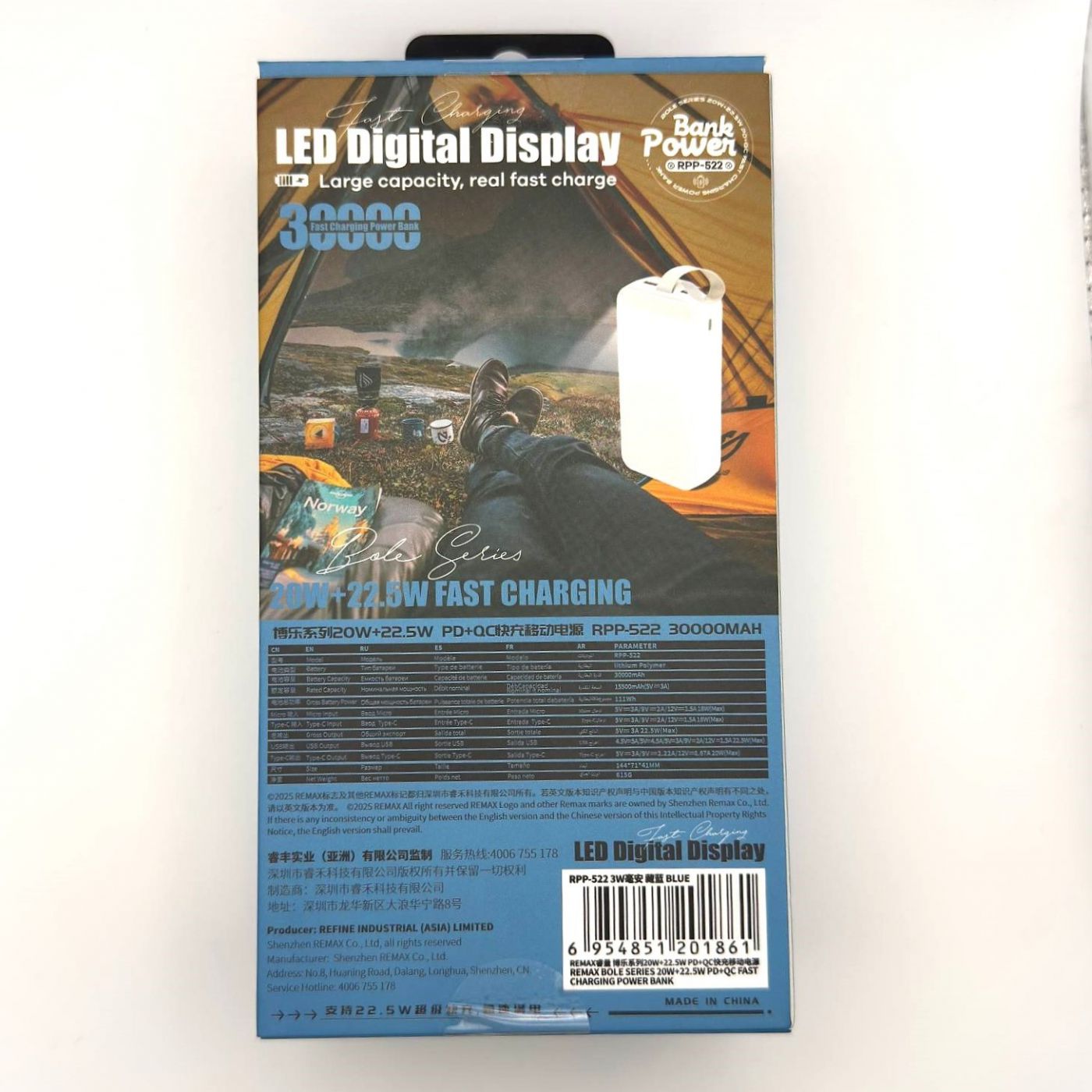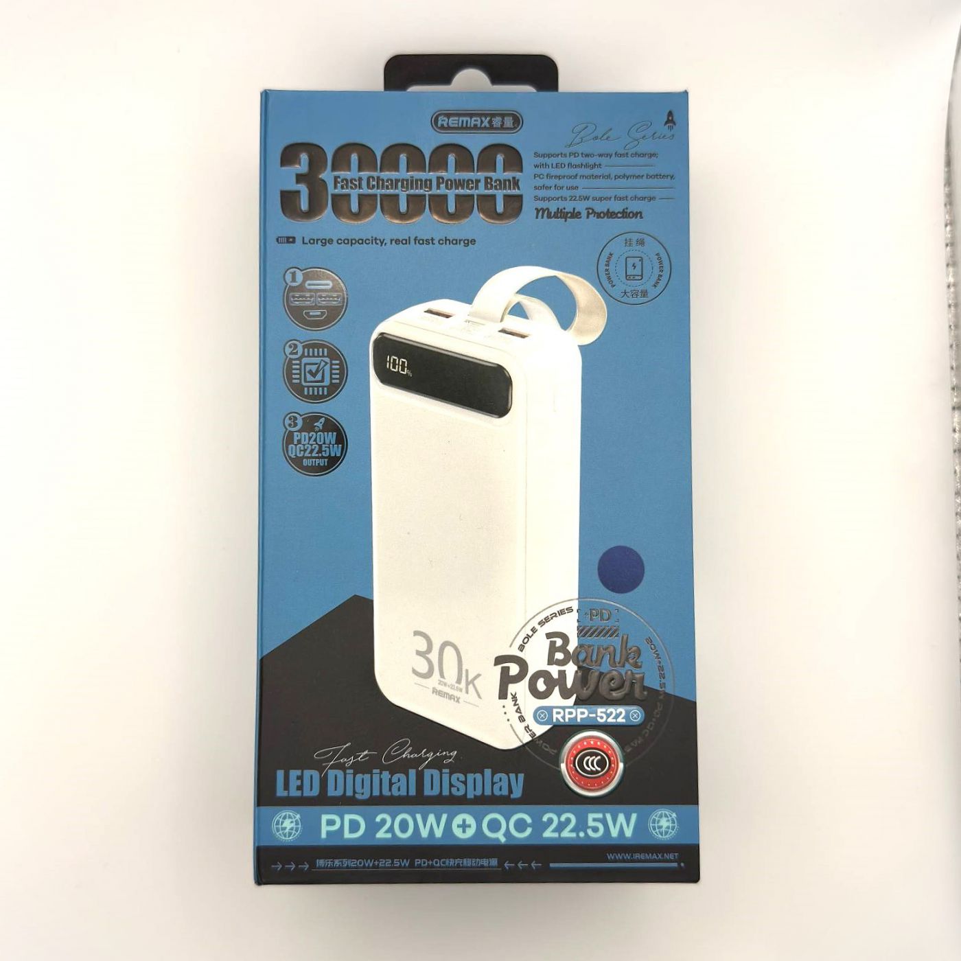 Внешний аккумулятор Remax RPP-522 30000 mAh (22.5W/QC3.0/PD/2USB/MicroUSB/Type-C/LCD) синий. Гигантский объем этого аккумулятора не даст вашему гаджету шансов оставить вас без связи в вашем путешествии. Наличие дисплея доставит больше удобства при использовании, а практичный цвет поможет вашему внешнему аккумулятору всегда выглядеть опрятно и стильно. Remax - одна из лучших фирм, долгие годы создающая аксессуары и накопившая бесценный опыт в этом деле.