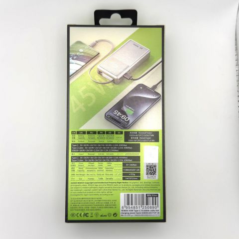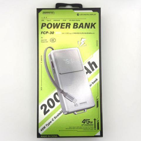 Внешний аккумулятор (Power Bank) Remax FCP-30 для 20000mAh (45W, PD, Type-C, встроенный кабель Type-C, LCD) (серый). Информативный внешний дисплей, внушительная емкость, практичный цвет.