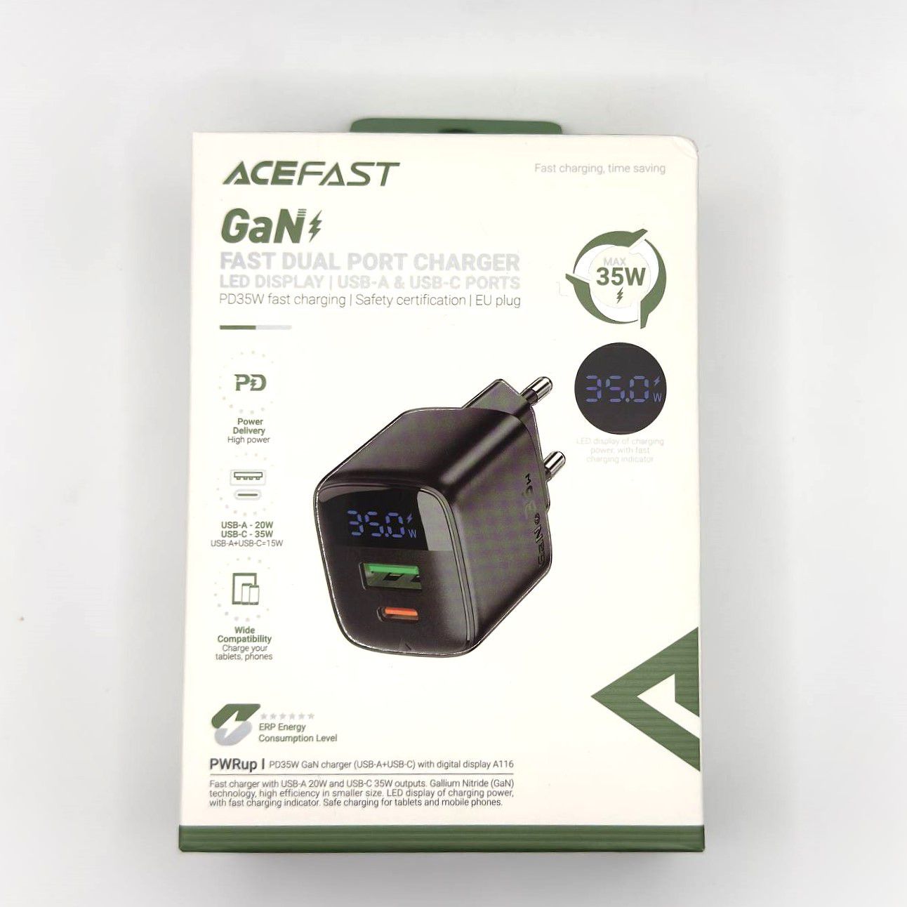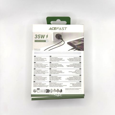 Представляем сетевое зарядное устройство нового поколения – Acefast A116. Благодаря технологии GaN (Gallium Nitride), эта зарядка обладает высокой мощностью 35W и компактным размером. Поддержка QC3.0 и PD, два универсальных порта – USB и Type-C, а также информативный дисплей делают Acefast A116 идеальным выбором для зарядки ваших устройств дома или в офисе.