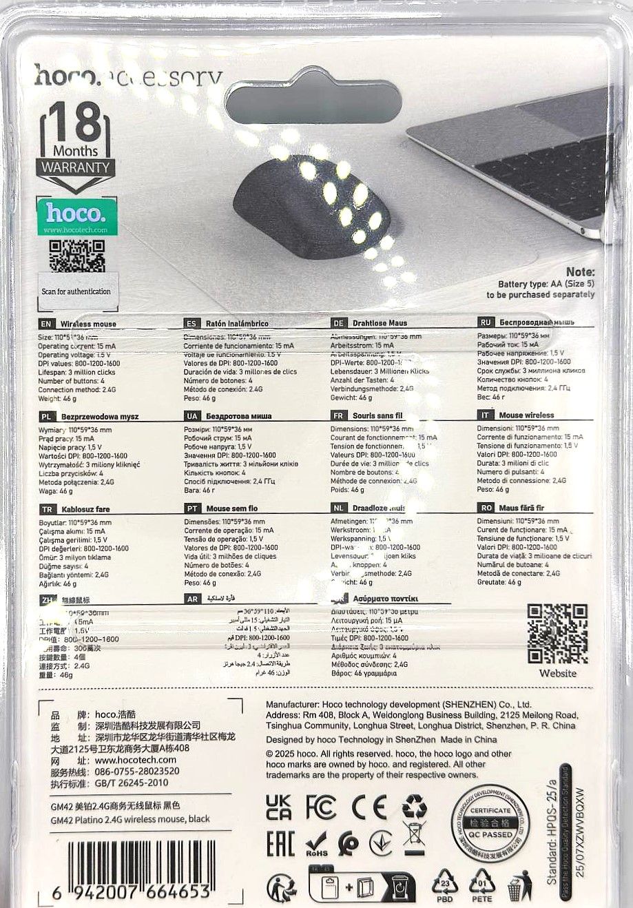 Высокая точность: Оснащенная современным оптическим сенсором, мышь Hoco GM42 обеспечивает плавное и точное перемещение курсора, что критически важно как для работы с документами, так и для игр.