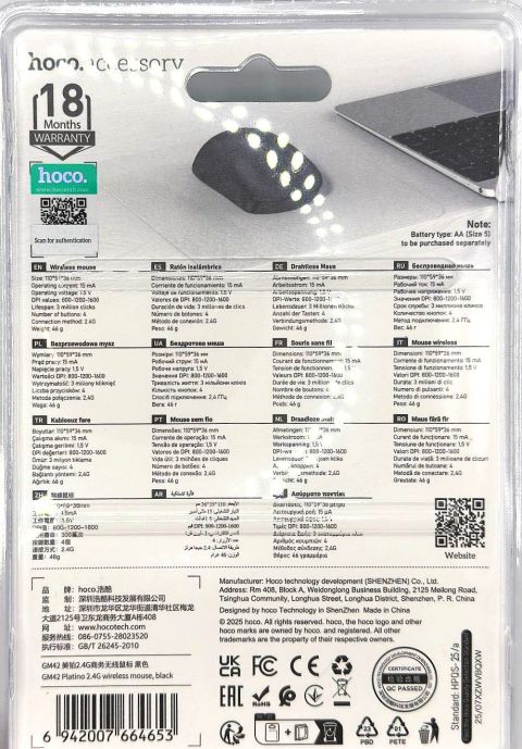 Представляем беспроводную мышь Hoco GM42 в элегантном черном цвете – идеальное сочетание передовых технологий, эргономичного дизайна и безупречной функциональности. Эта мышь создана для тех, кто ценит свободу, комфорт и производительность.